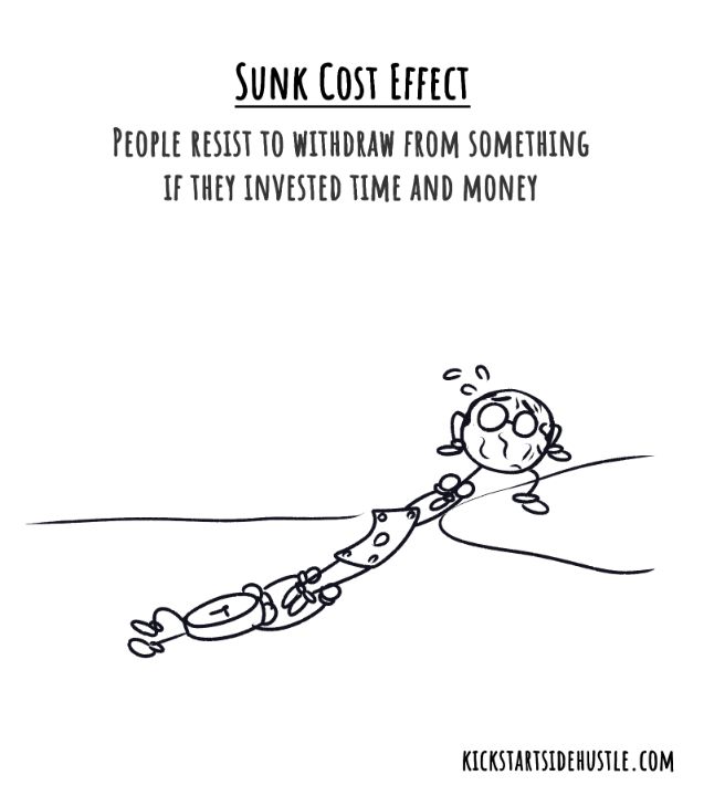 Think of staying in a bad project just because you spent months on it, even though it doesn't earn any money. Or you're stuck in a bad relationship even though you don't love the other person anymore. The time you already invested pulls you in, not the actual value.