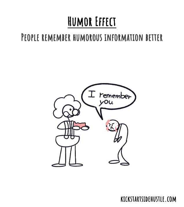 Humor Effect means we remember things better when they make us laugh. A joke, a funny twist, or a light tone sticks in the mind far longer than something serious and flat.