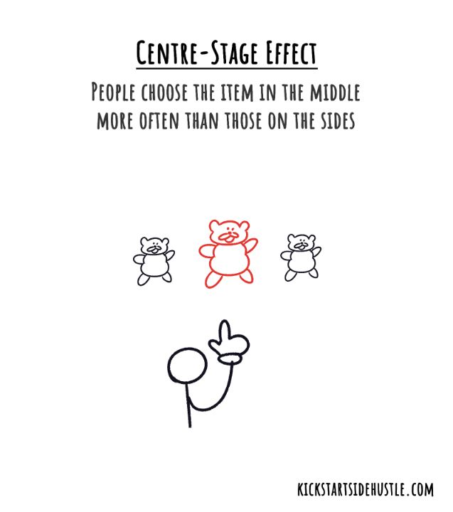 In marketing this effect shapes how people choose plans, products, and bundles. Putting the preferred option in the center increases its chances of being picked because it feels like the default.