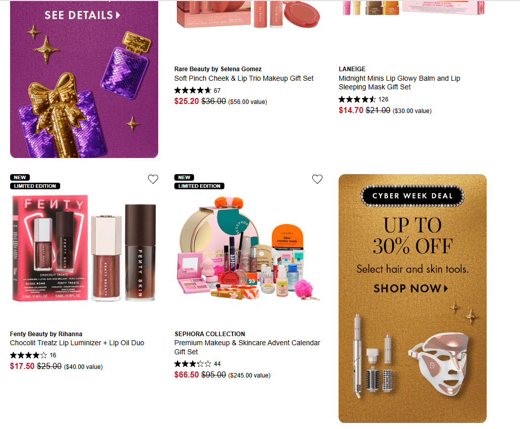 On category pages, Sephora frequently positions high-margin or trending products in the middle column of the 3-column product grid.