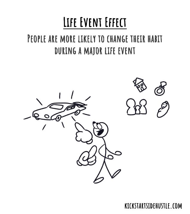 Life Event Effect means that people are more likely to switch habits and brands when they have undergone a life event. Changes like moving, having a child, starting a new job, or a breakup make old habits break.