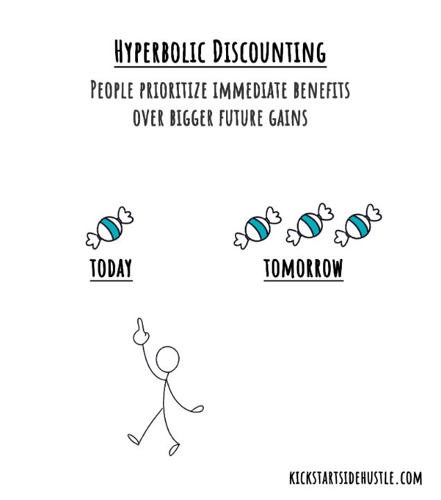 Hyperbolic Discounting is a fancy term for our tendency to be impatient and inconsistent over time. The closer something is in time, the more valuable it feels.